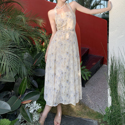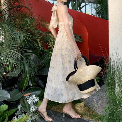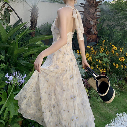 Chiffon Backless Halterneck Floral Long Dress