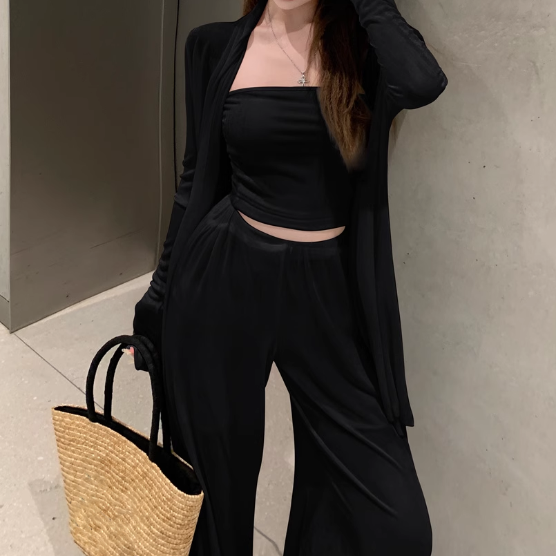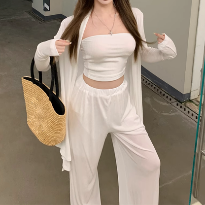 Elastic Vest Wide-Leg Pants Long-Sleeved Cardigan Set