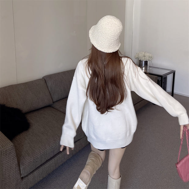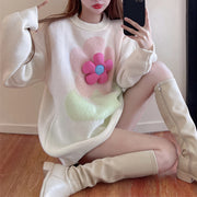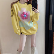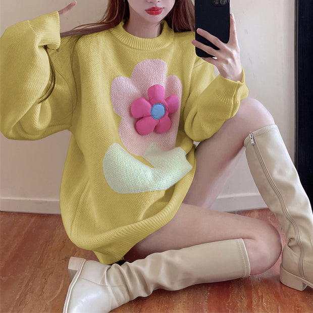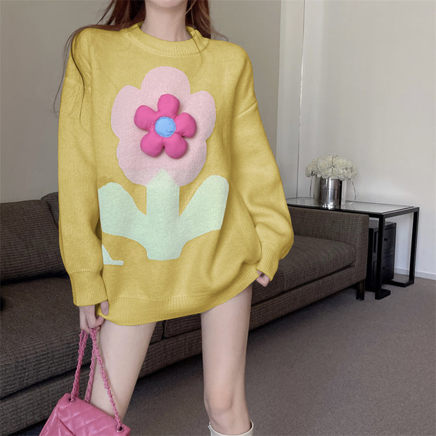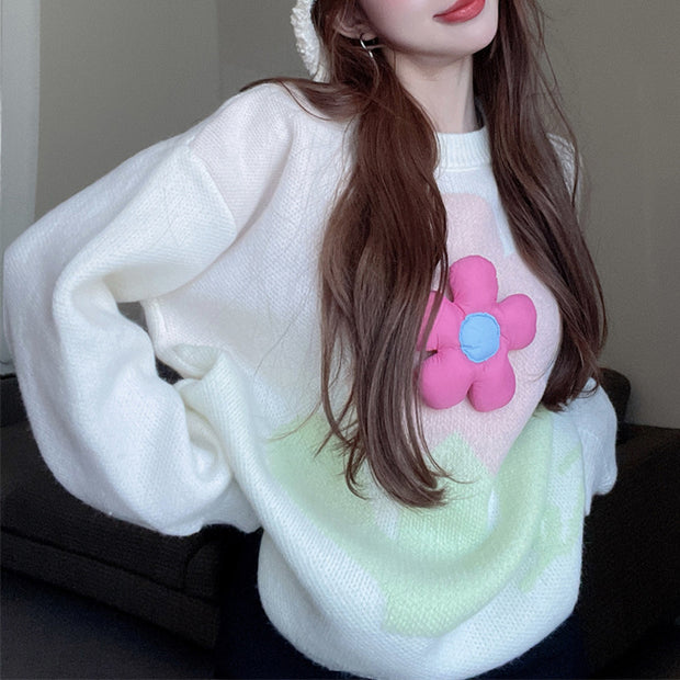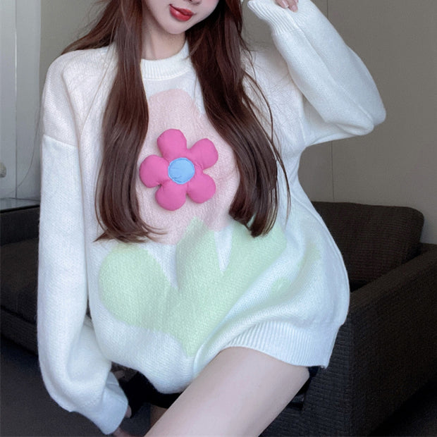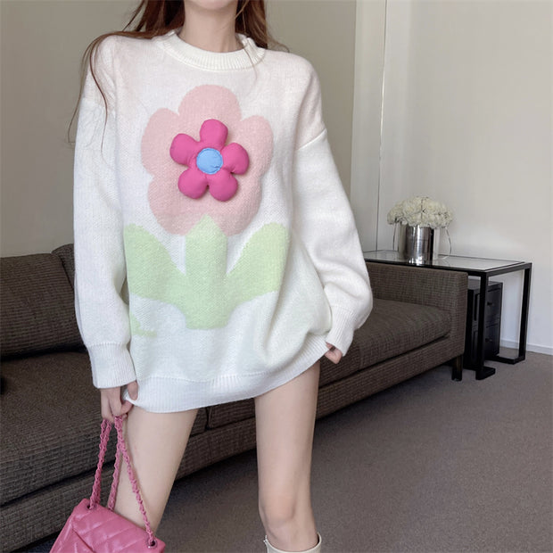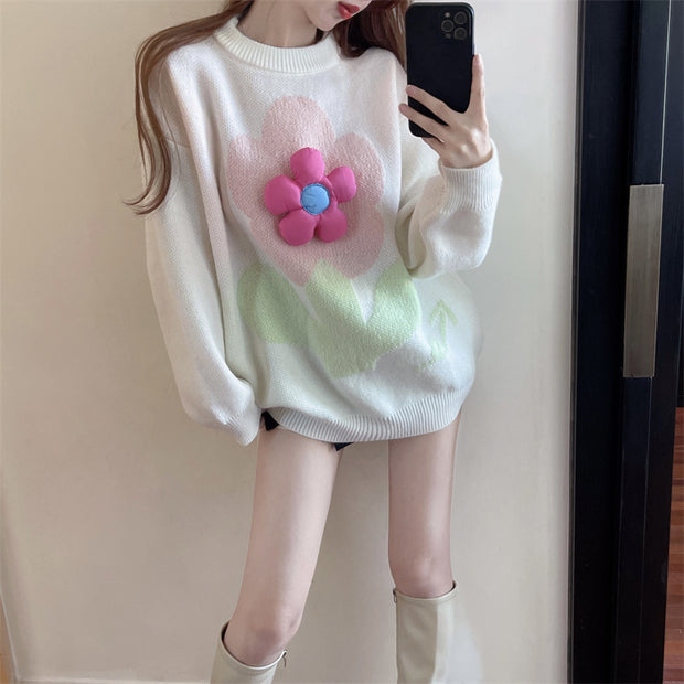 Fashionable Loose Round Neck Pullover Floral Long-Sleeved Knitted Sweater