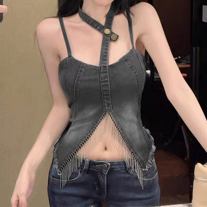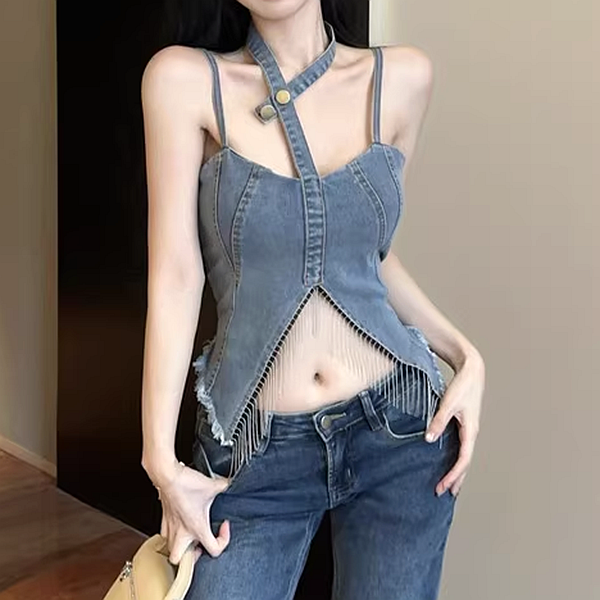 Fringed Irregular Navel-Baring Slim Denim Vest