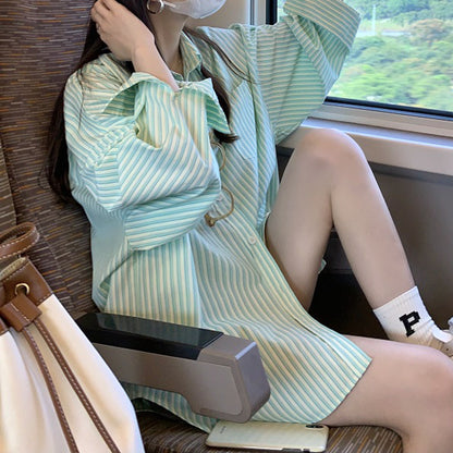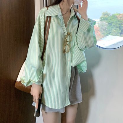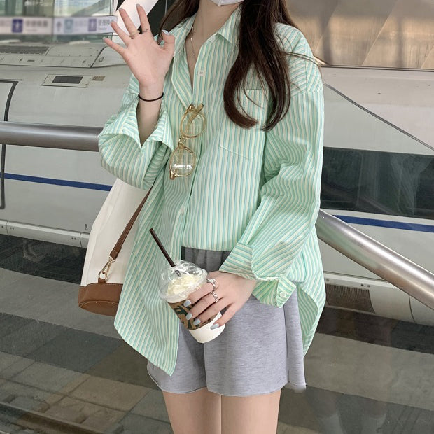Green Striped Long-Sleeved Loose Casual Shirt