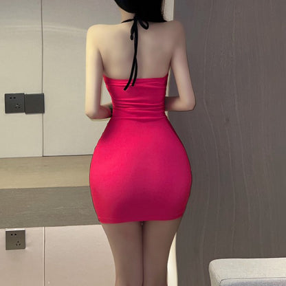 Halter Neck Bodycon Stretch Color Block Backless Bow Dress