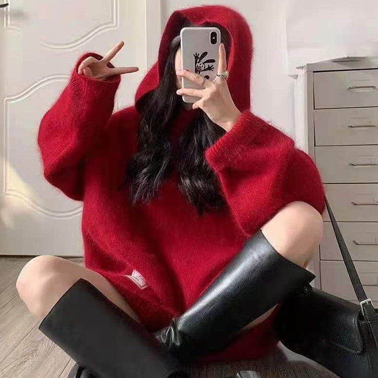 Hooded Loose Red Long Sleeve Christmas Sweater