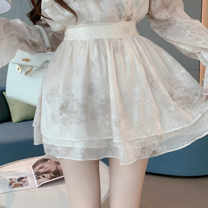 Ink Painting Halter Neck Shirt Top Cake Skirt Set