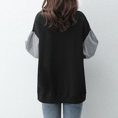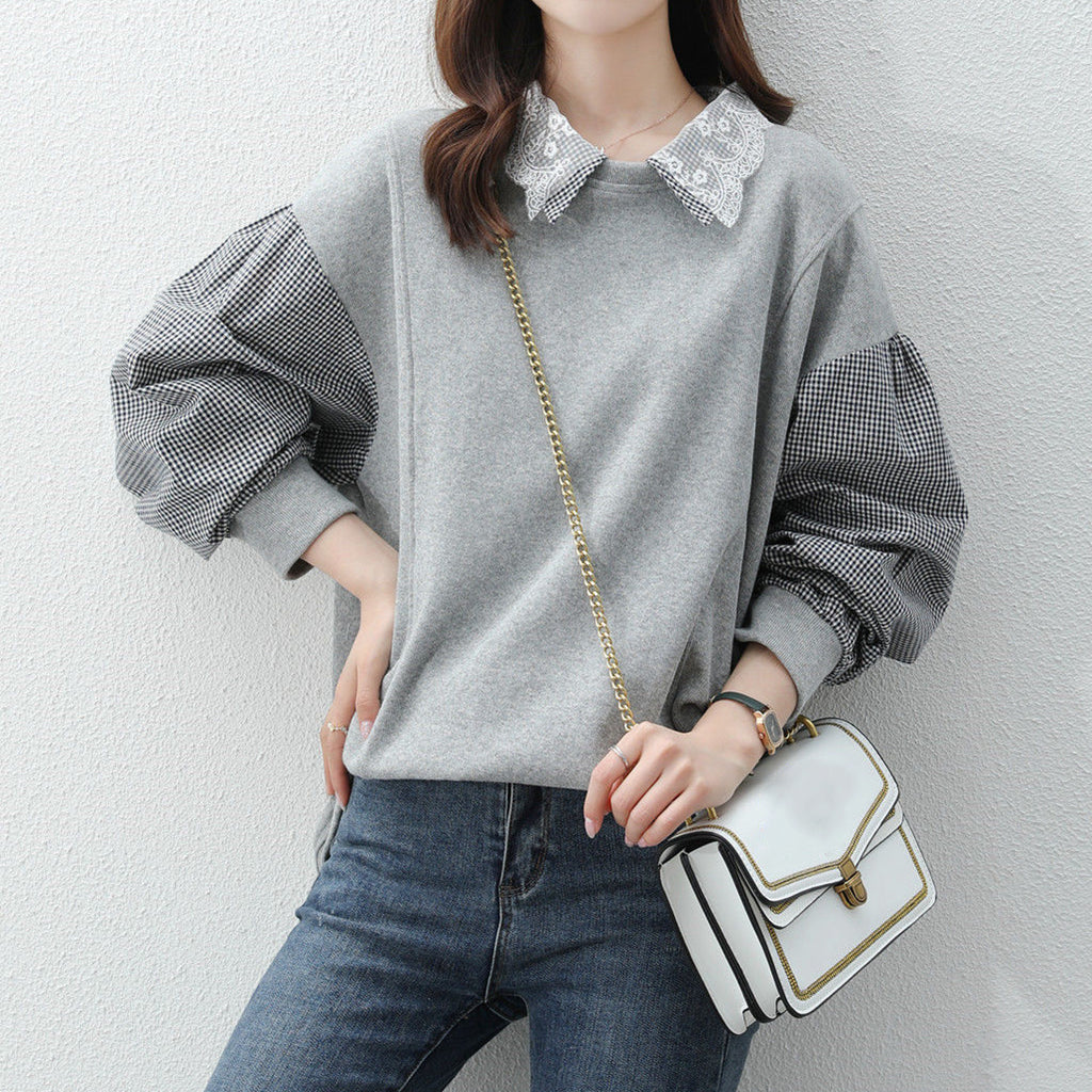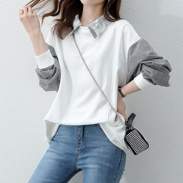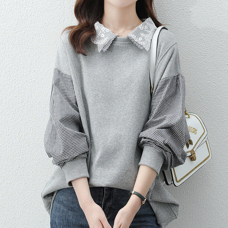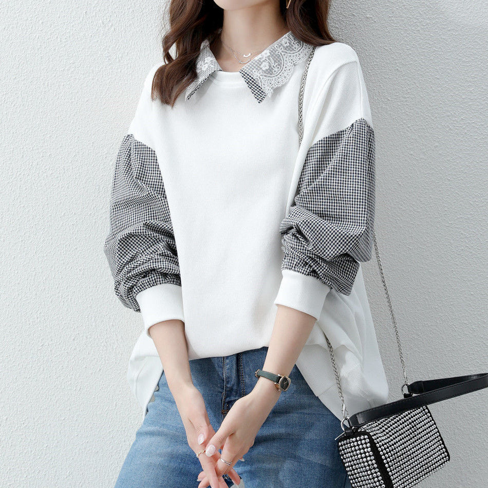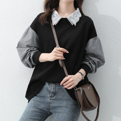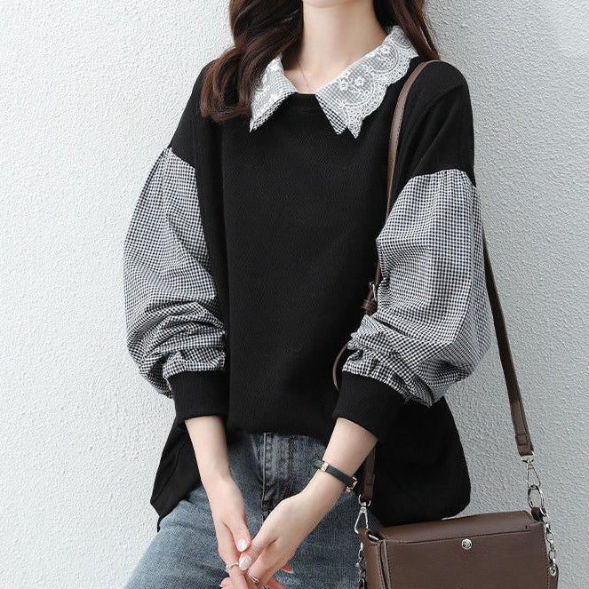Lace Lapel Plaid Long Sleeve Loose Sweatshirt