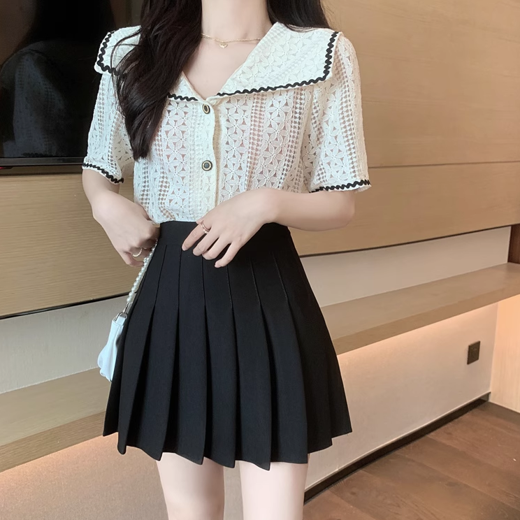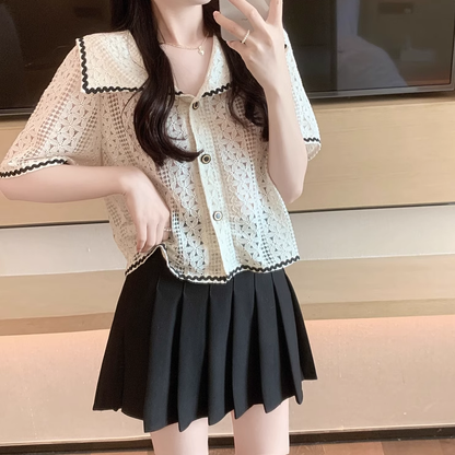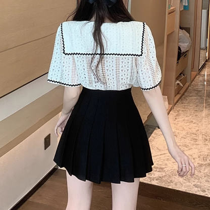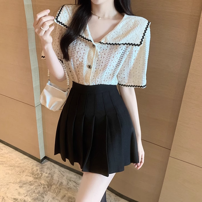 Large Lapel Lace Shirt Top Pleated Short Skirt Set