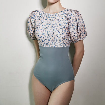 Puff-Sleeved Open-Back Floral One-Piece Swimsuit