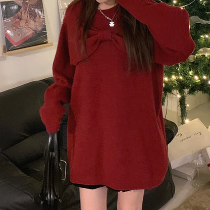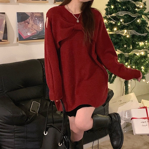Red Bow Off-Shoulder Christmas Sweater Dress