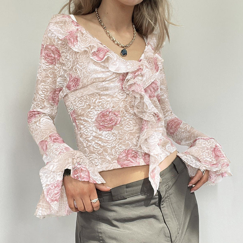 Ruffled V-Neck Trumpet Long-Sleeved T-Shirt Rose Print Lace Top