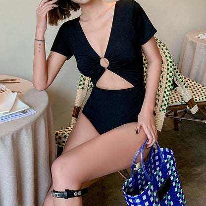 Short Sleeve Solid Color High Waist One Piece Swimsuit