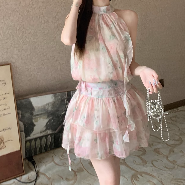 Sleeveless Flower Ribbon Top High Waist Cake Skirt Set
