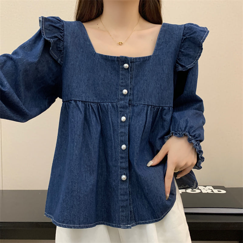 Square Neck Denim Ruffled Loose Top
