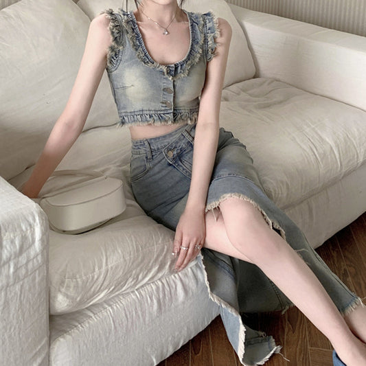 Shabby Frayed Denim Top High Waist Irregular Slit Skirt