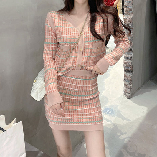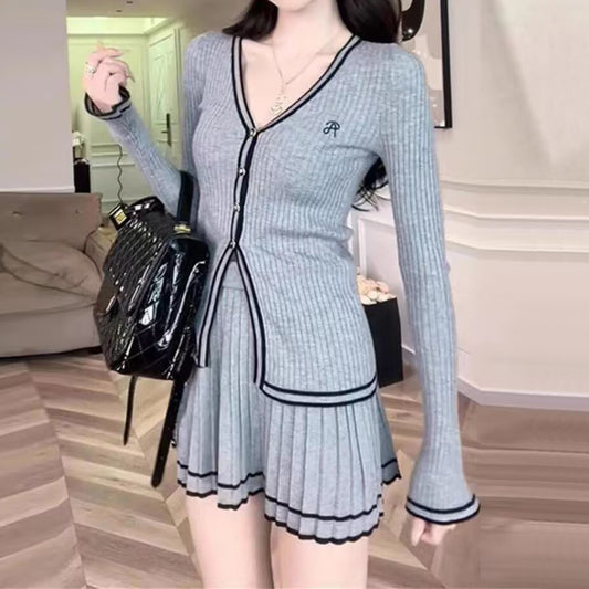 Fashionable And Sexy V-Neck Single-Breasted Knitted Cardigan Top And Skirt Two-Piece Set