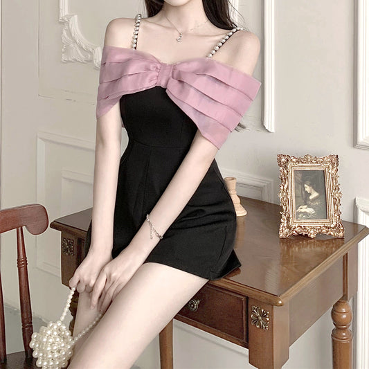 Bow Sleeveless Off-Shoulder Satin Top Cake Skirt Set