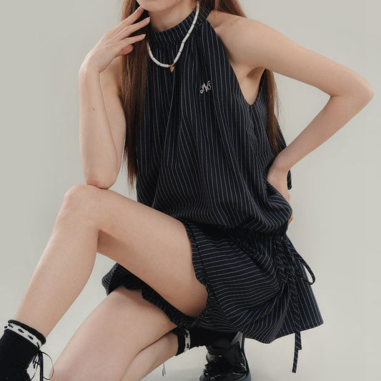 Hollow Blouse Backless Vest Double Belt Shorts Set