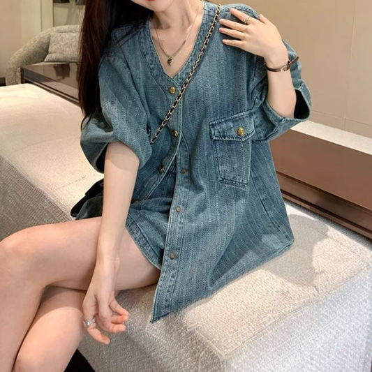 Loose V-Neck Denim Top Wide-Leg Shorts Set