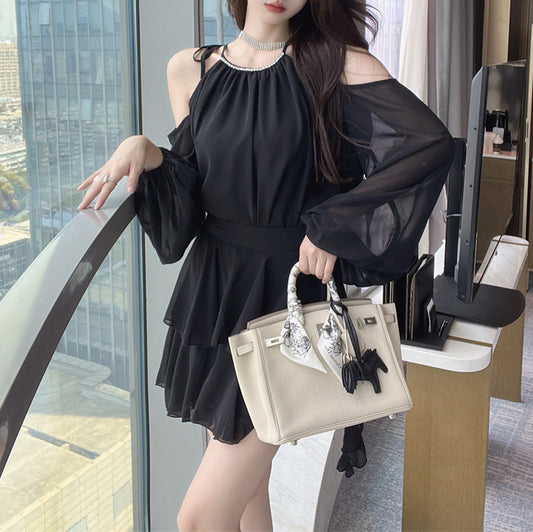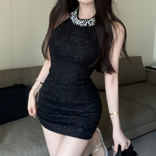 French Sexy Exposed Nail Beads Hollow Halter Neck Dress