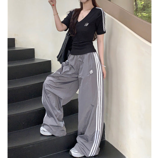 Short-Sleeved V-Neck T-Shirt Sports Striped Pants Set