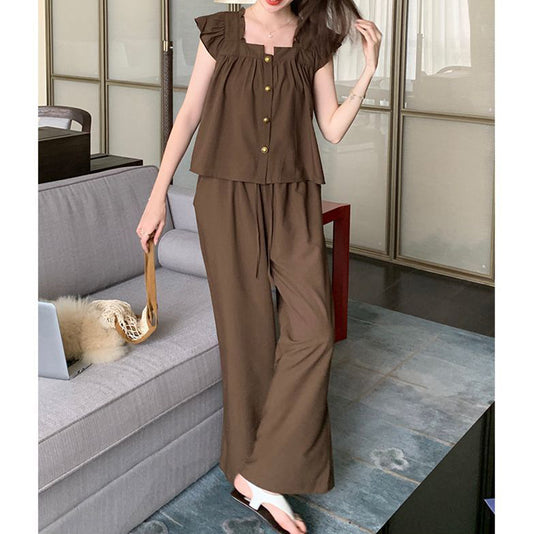 Summer Casual Slim Retro Square Neck Top Wide Leg Pants Two Piece Suit