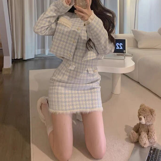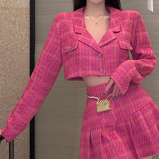 Tweed Buttoned Plaid Jacket Elegant Pleated Skirt Set