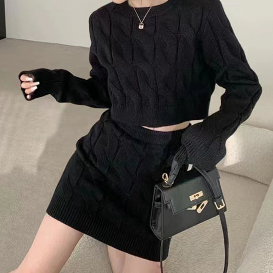 Retro Sexy Round Neck Cable Knit Top High Waist Miniskirt Set