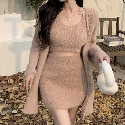 Mohair Cardigan Sweater Camisole Skirt Knitted Set