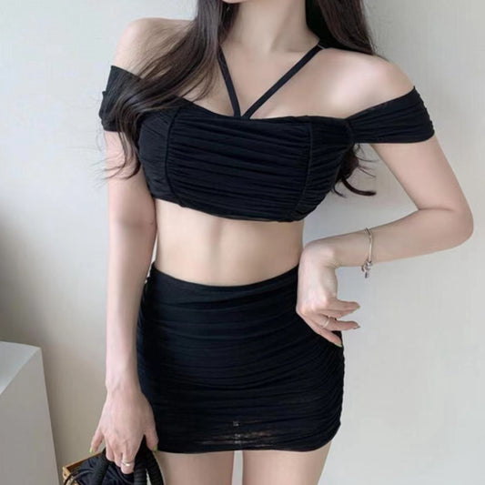 Chain Black Backless Skirt One Piece Swimsuit Set