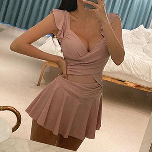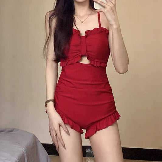 Solid Color New Fungus Edge Back Cross One-Piece Swimwear