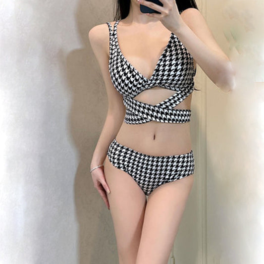 Crossed Houndstooth Sexy Bikini Swimsuit Set