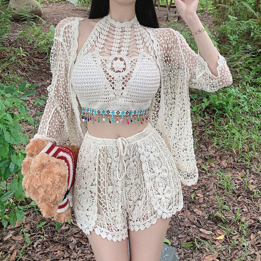 Hollow Knit Cardigan Split Swimsuit Three Piece Set