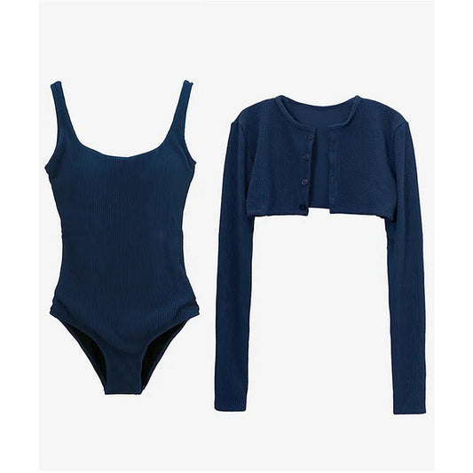 Solid Color Long-Sleeved One-Piece Swimsuit Set