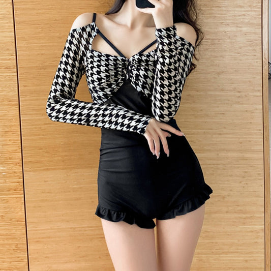 Houndstooth Backless Skirt One-Piece Swimsuit