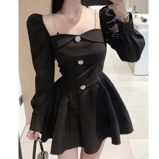 French Square Neck Puff Sleeve Waist Dress With Bag