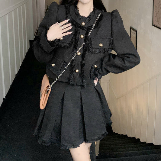 Fringed Single-Breasted Coat Top Pleated Skirt Set