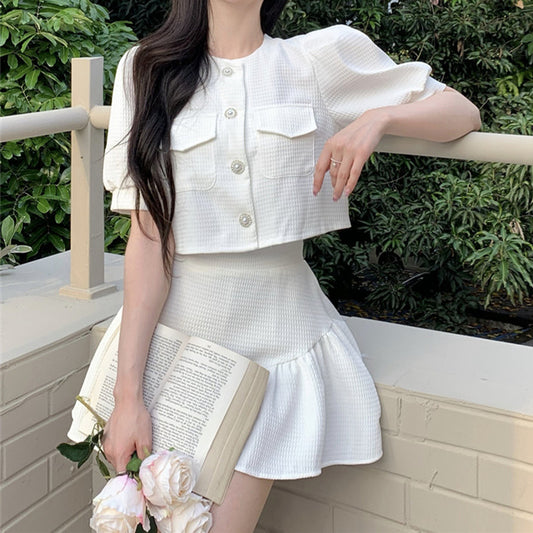 Puff Sleeve Breasted Jacket High Waist A-Line Skirt Set