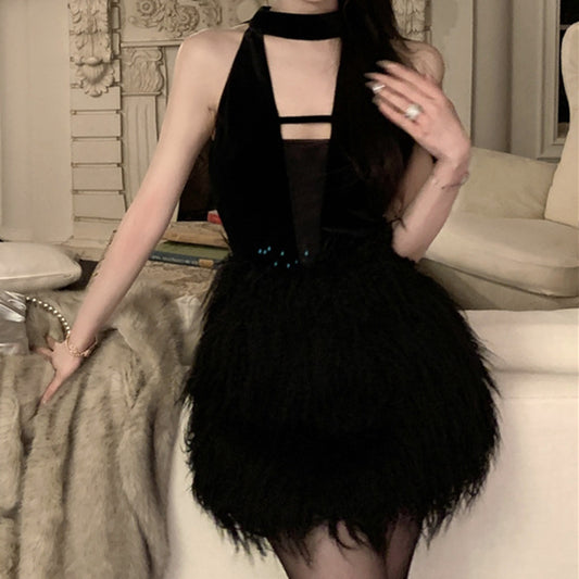 Mesh Paneled Plush Sleeveless Black Dress