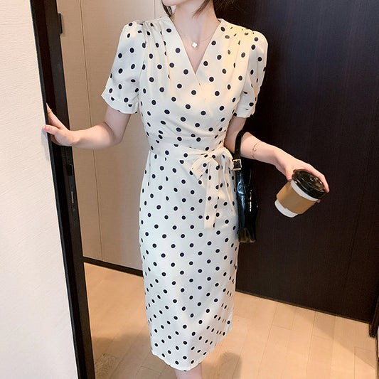 Polka Dot V-Neck Slim Puff Sleeve Lace-Up Dress